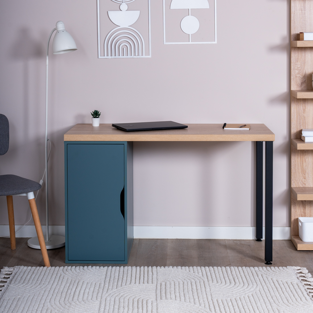 S01521 ИНГАР 1/ДВ/T стол письменный 120x75x55, дуб беленый/серо-бирюзовый/черный