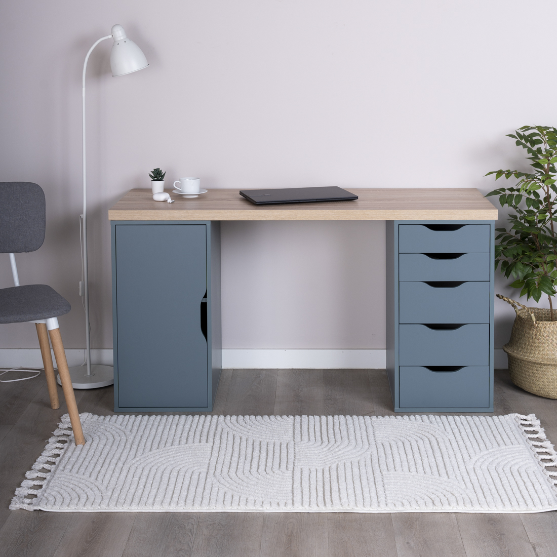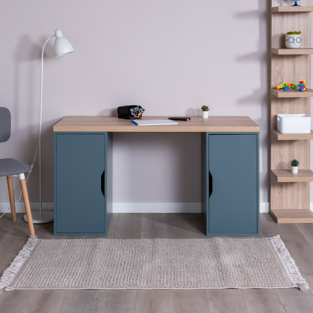 S01583 ИНГАР 2/ДВ/ДВ стол письменный 140x75x55, дуб беленый/серо-бирюзовый